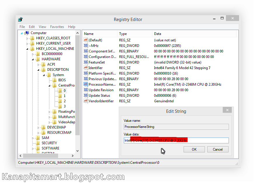 - ඔන්න ඕකේ තියෙනවා ProcessorNameString කියල එකක්.. අන්න ඔතන තමයි අපේ පරිගණකයේ Processor එක ගැන විස්තරේ තියෙන්නේ.. ඒක උඩ Double Click කලාම ඔය පහළ තියෙනව වගේ Window එකක් Open වෙයි.. ඔන්න ඕකෙන් ඔයාගේ පරිගණකයේ Processor එකේ නම වෙනස් කරගන්න.